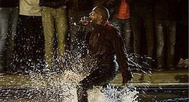 Уест скочи в езерото в столицата Ереван и събра погледите с импровизиран концерт. Носителят на 21 награди “Грами” влезе в езерото и след като се увери, че събралата се тълпа има добра видимост, изпълни шест парчета, преди полицията да сложи край на шоуто.