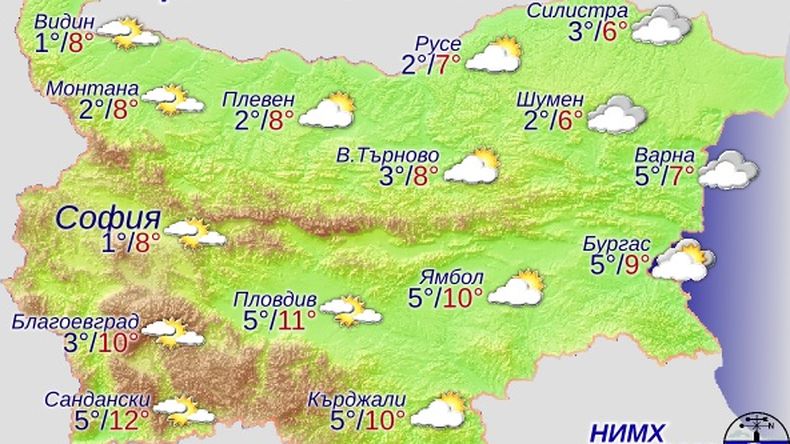 През следващите дни в по-голямата част от страната ще бъде почти тихо. В много райони в равнините, низините и котловините рано сутрин ще се образуват мъгли или ниска облачност, а на места ще се задържат по-дълго. Около и след обяд ще има и слънчеви часове. В планинските райони ще има повече слънце и ще бъде сравнително топло. Минималните температури ще са около 0 градуса, а максималните ще са в по-широки граници - в местата с по-трайна мъгла или повече облачност ще остават от 2 до 5 градуса, в останалите райони ще достигат 8 – 10 градуса.