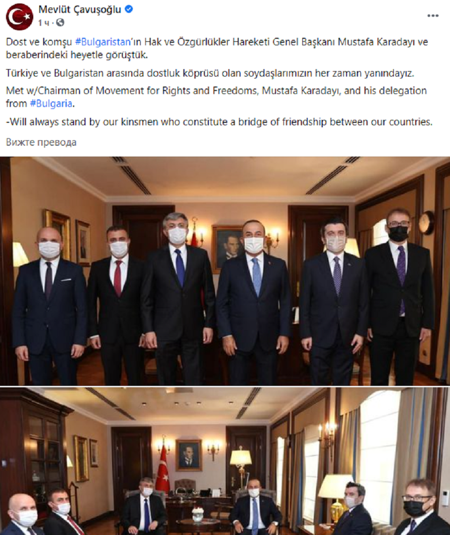"Срещнахме се с нашия приятел от ДПС Мустафа Карадайъ и делегация от България. Винаги сме с нашите сънародници, които са мостът между Турция и България", пише Чавушоглу.
