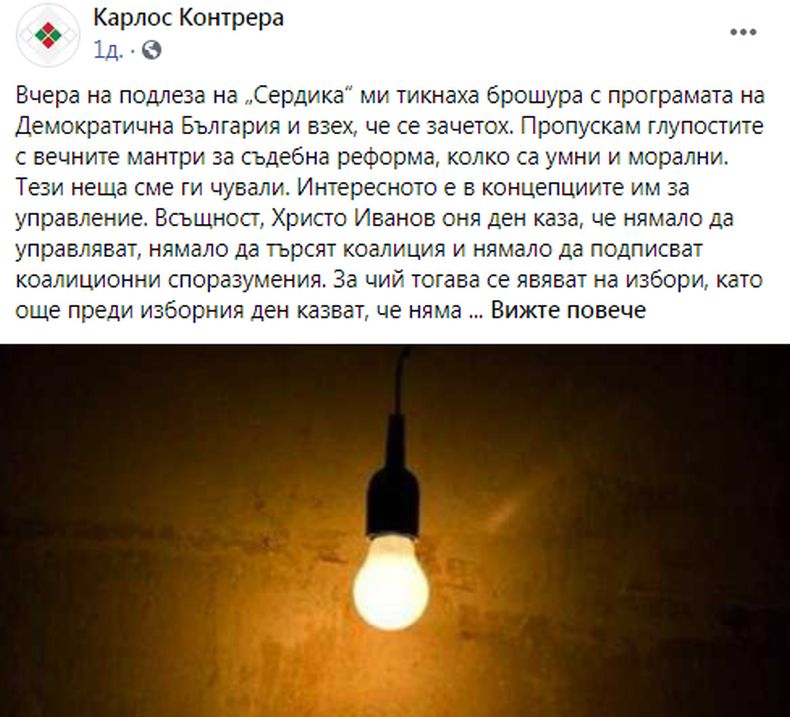 "Вчера на подлеза на „Сердика“ ми тикнаха брошура с програмата на Демократична България и взех, че се зачетох. Пропускам глупостите с вечните мантри за съдебна реформа, колко са умни и морални. Тези неща сме ги чували. Интересното е в концепциите им за управление. Само по себе си това „алтаво“ поведение не е изненада за тези групички. По-опасното са утопиите, които са си напляскали в програмата. И, не дай Боже, по ирония на съдбата да им се падне шанс да ги прилагат на наш гръб. " Това написа на страницата си във "Фейсбук" Карлос контрера от ВМРО.