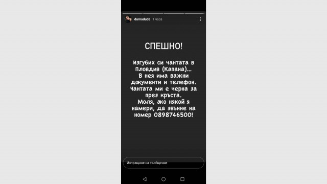В пост в Инстаграм младата звезда се жалва за загубата и съобщава, че в чантата, която е черна на цвят за през кръста, е имало важни документи и телефон.