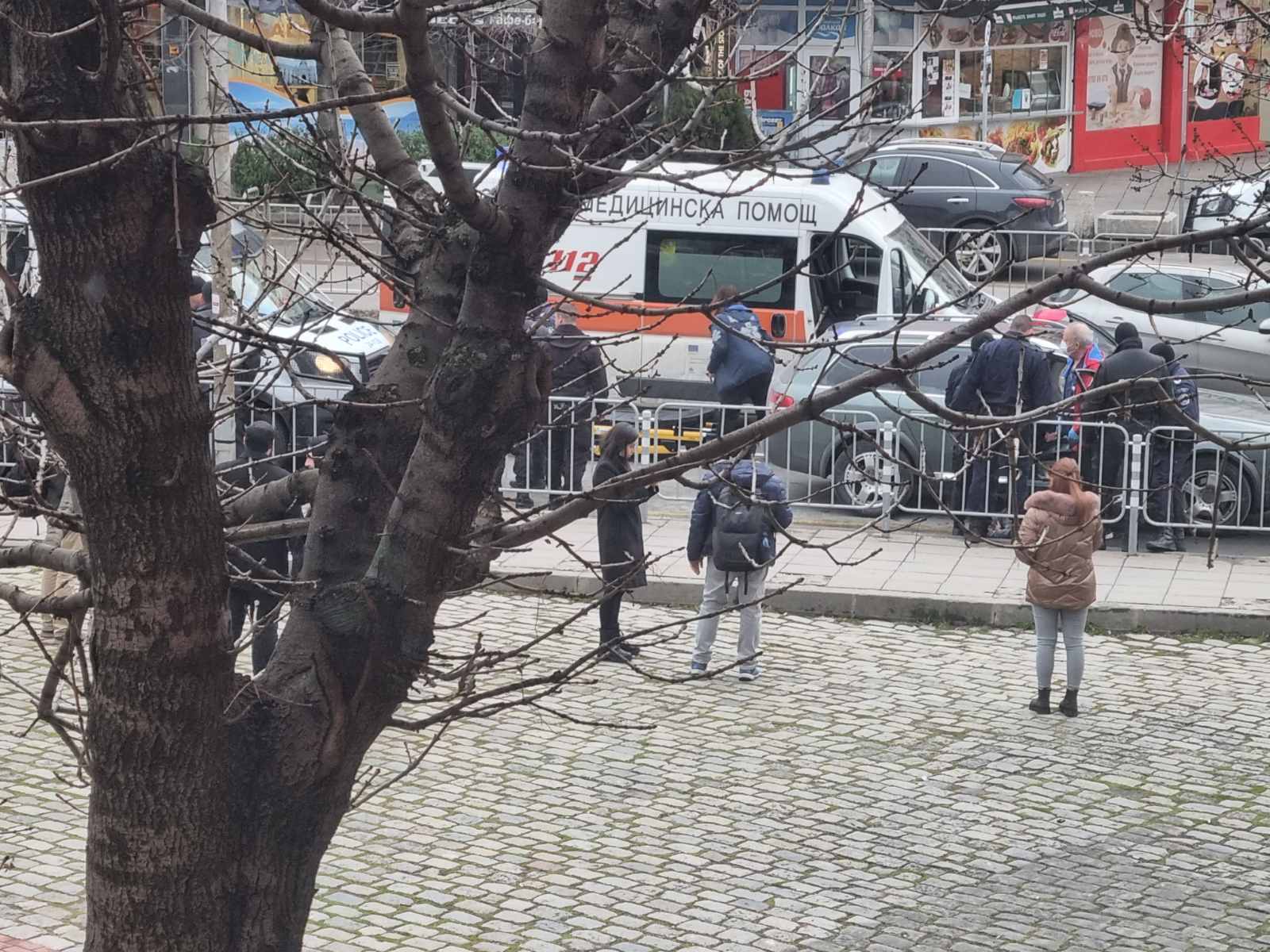 Задържани са двама души. Минути преди 16 ч. е станал инцидент с бус, пълен с полицаи, като един от участниците в произшествието е пострадал тежко и е откаран в "Пирогов". В района има коли на жандармерията.