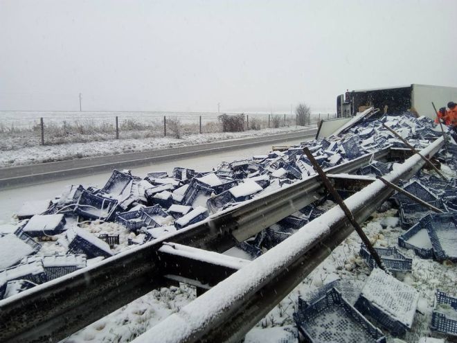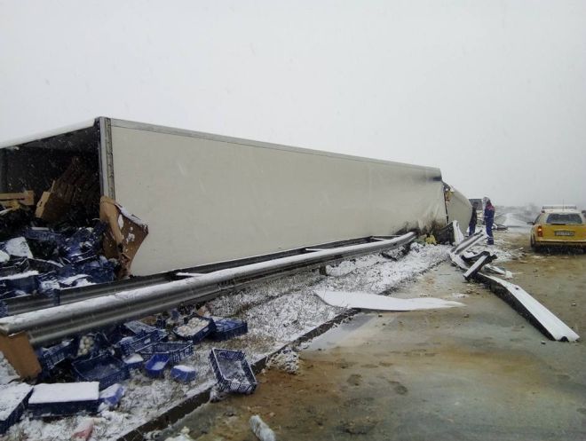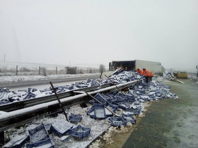 Заради удара товарът му от касетки с гъби се разпилява по магистралата. Движението ще пренасочва в едната лента, докато бъде събра разчистено трасето.