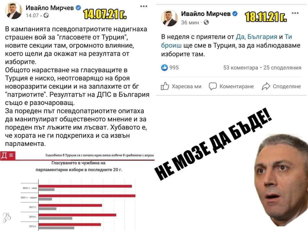 Така на 14 юли Мирчев пише във Фейсбук, че общото нарастване на гласувалите там на вота на 11 юли, едва ли не е пренебрижимо малко и определя резултата на ДПС в България като разочароващ.