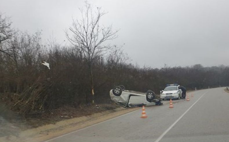 Водач на лек автомобил се движел в посока областния град, когато малко преди селото изгубил контрол над колата и се обърнал по таван на пътя.