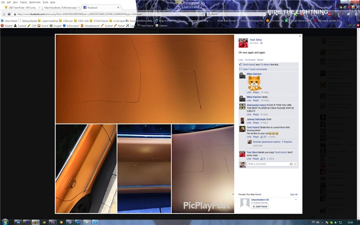 По този повод защитникът на червените Тончи Кукоч не е пропуснал да се пошегува със своя съотборник, пишейки му на стената във "Фейсбук". "Брате, това е работа на Кирил Домусчиев. Той е направил това на твоята кола", след което е постнал три усмивки.