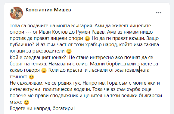 Това са водачите на моята България. Ами да живеят лицевите опори - от Иван Костов до Румен Радев. Ама аз нямам нищо против да правят лицеви опори. Но да ги правят вкъщи. Защо публично? И аз съм част от този храбър народ, който има такива юнаци за ръководители. Това коментира с безпощадна ирония журналистът Константин Мишев.