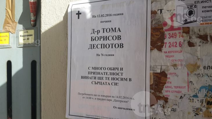 Бившият депутат от СДС д-р Тома Деспотов е починал на 12 февруари, след като месец лекарите се бориха за живота му в УМБАЛ „Св. Георги”, съобщава "TNS.bg". През целия си престой в болницата Деспотов бе в интензивното отделение заради тежките мозъчно-черепни и гръдни травми, както и фрактури на крайниците.
