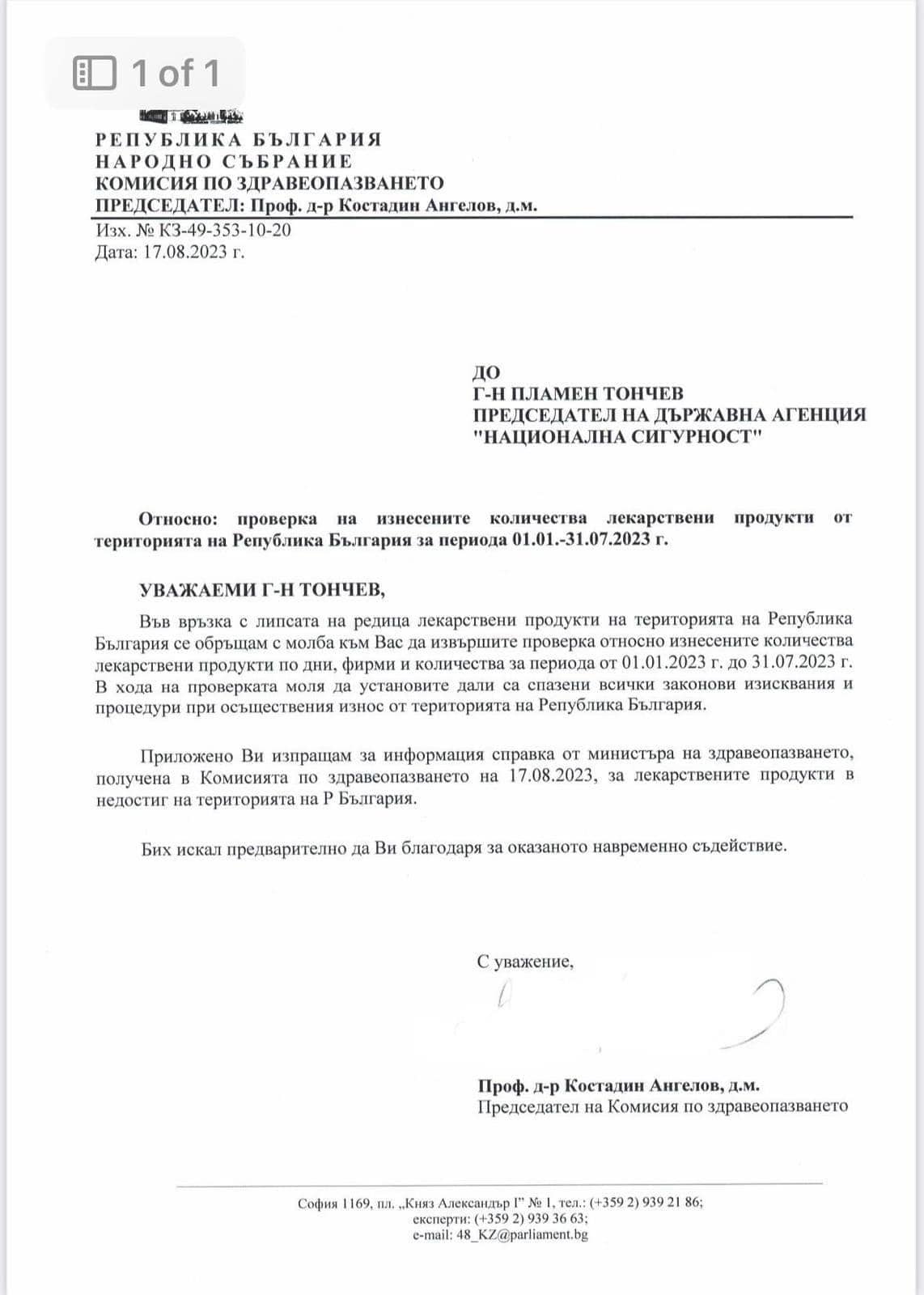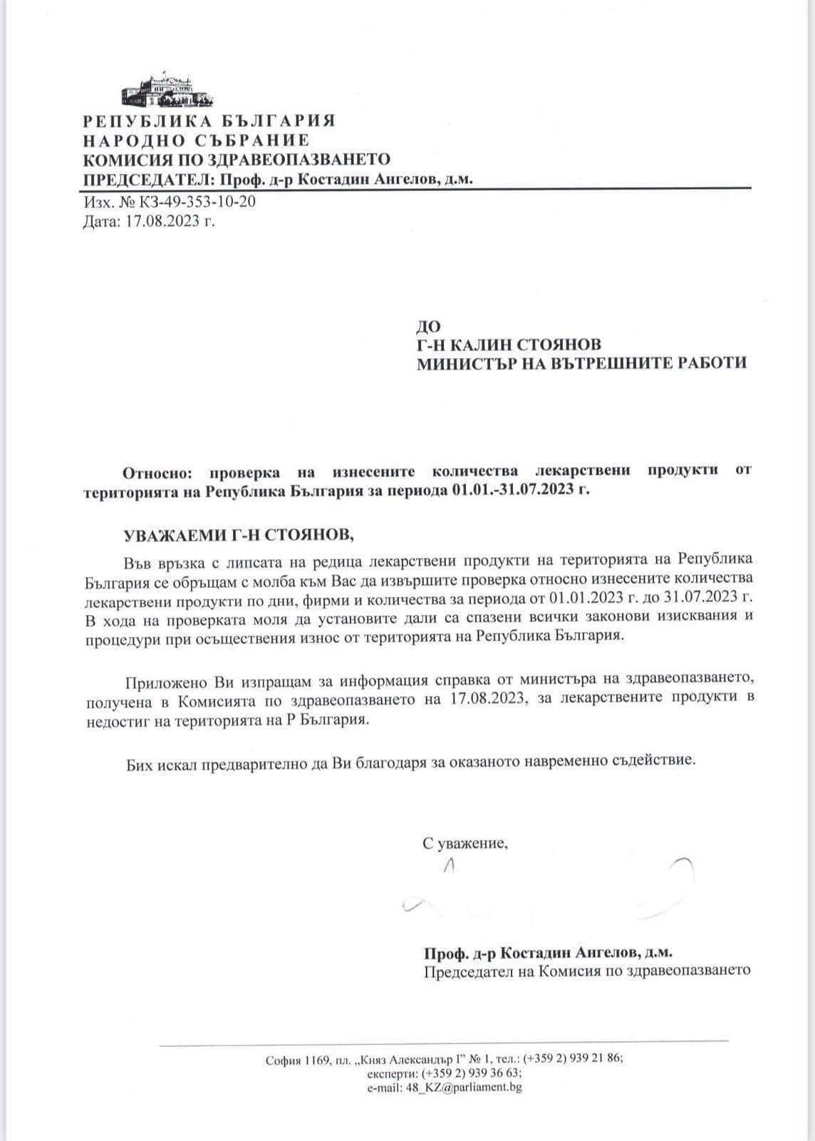 Председателят на парламентарната комисия по здравеопазване проф. Костадин Ангелов сигнализира МВР и Държавната агенция "Национална сигурност" (ДАНС) с искане да извършат проверки във фирми, изнасяли лекарства. Това съобщи Ангелов в профила си във Facebook.