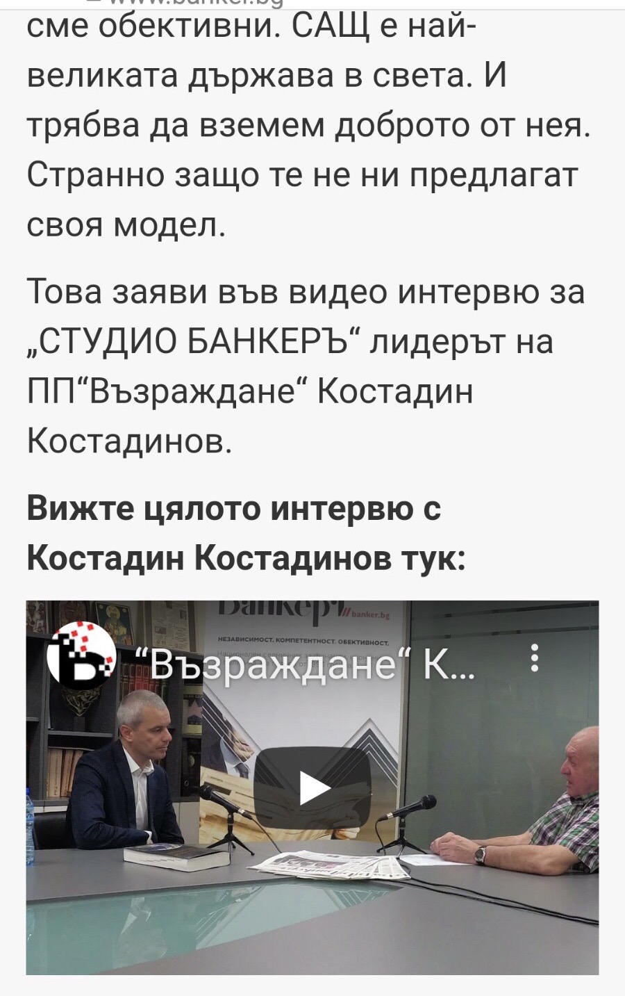 „САЩ са най-великата страна в света“, заяви председателят на партия „Възраждане“ Костадин Костадинов в интервю за сайта „Банкер“.