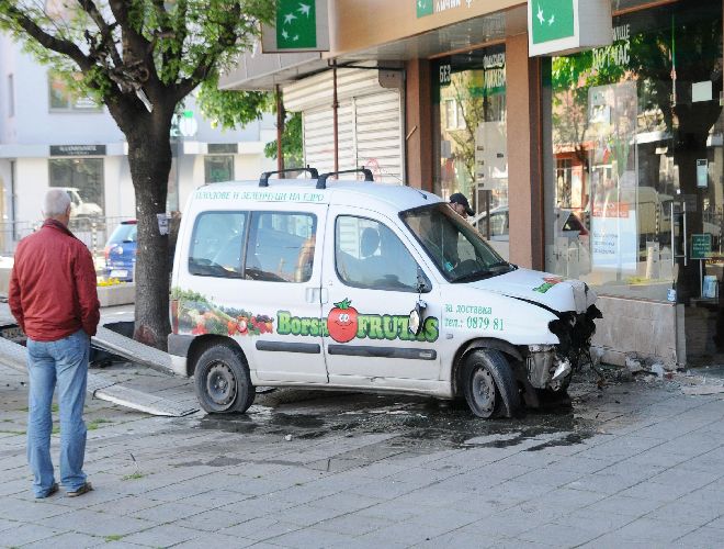 Автомобилът е разбил бетонните колчета на тротоара и се ударил в прозорците на офиса.