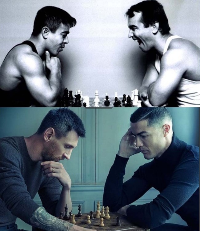 Снимката, на която футболните звезди играят шах върху луксозно куфарче - част от рекламна кампания, е едно към едно с фотос на родените в кърджалийски села олимпийски шампиони в силовия спорт, снимана години по-рано.