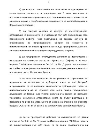 2.Незабавно да се предприемат необходимите мерки за осигуряване на безопасна  експлоатация на път Е 79. Да се прилагат съществуващите ограничения на скоростта, колчета и камери. Да се изградят и обновят 6 зони за аварийно спиране в Кресненското дефиле.