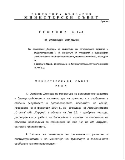 Договореностите между Европейската комисия и техническия екип са потвърдени от Министерски съвет с Решение 146 от 29.02.2024г.