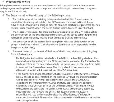 Европейската комисия има няколко конкретни препоръки, като смята, че е важно да се постигне напредък по проекта и подобри тази жизнено важна транспортна връзка, като се осигури съответствие със законодателство на ЕС.