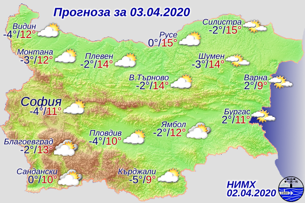 През деня ще бъде слънчево, със слаб южен вятър. В следобедните часове е възможно ново заоблачаване, но до вечерта валежи не се очакват. Дневните температури вече ще са близки до нормалните за април - от 9 до 14-15 градуса.