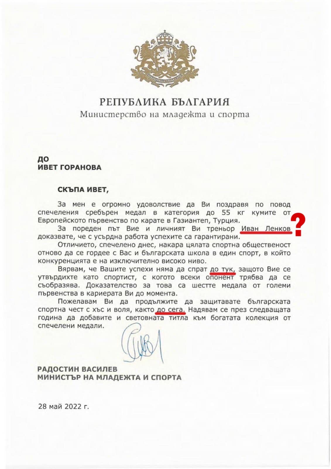 Поздравления на Ангел Ленков за медала на Ивет Горанова. Този Иван, който е получил телеграма от сегашния спортен министър, не го познаваме.