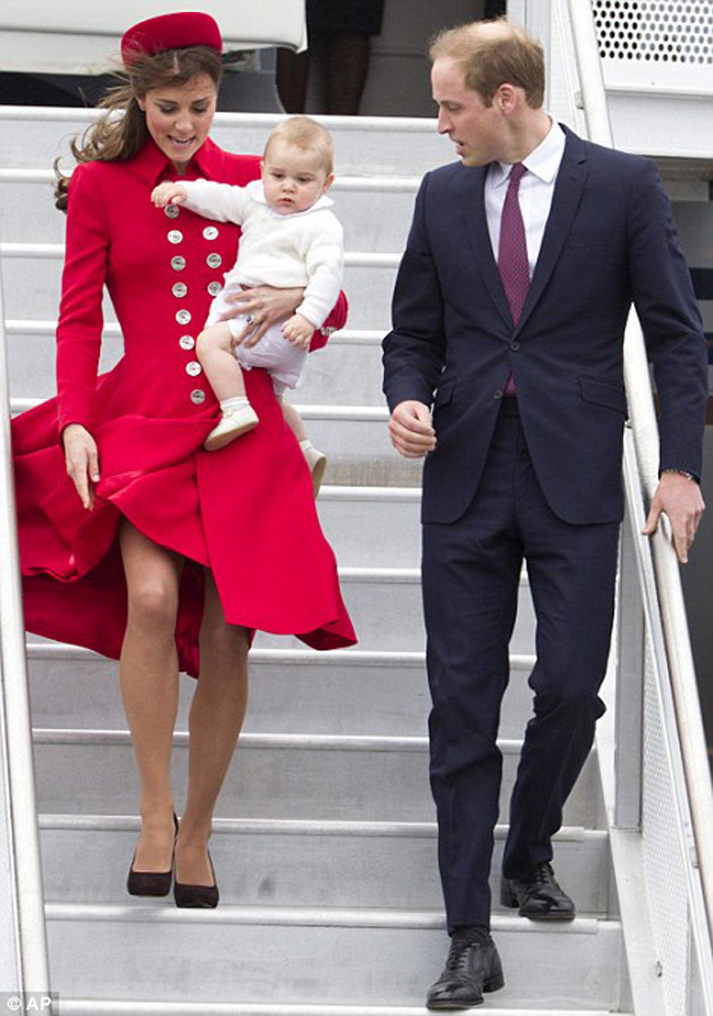 Престолонаследникът изглеждаше щастлив и спокоен въпреки 30-часовия полет от Лондон. Той носеше кремава жилетка върху бяла риза, съчетани с бели шорти и меки кожени обувки и чорапи - идеални за бебе, което току-що започва да пълзи. Майка му бе избрала червено палто със златни копчета от британската дизайнерка Катрин Уокър, която беше любимка на принцеса Даяна. Тя си бе закачила платинена брошка във формата на сребърна папрат (емблема на Нова Зеландия), която е бижу на кралица Елизабет и ѝ е подарено през далечната 1953 г. от „Жените на Окланд“, малко след коронацията ѝ.