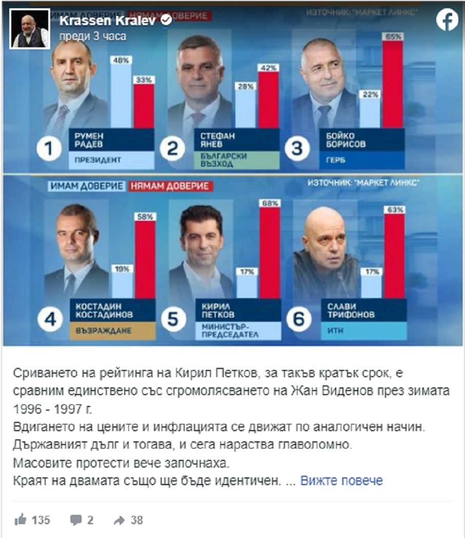 Сриването на рейтинга на Кирил Петков, за такъв кратък срок, е сравним единствено със сгромолясването на Жан Виденов през зимата 1996 - 1997 г.