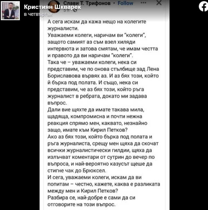 Ето какво още пише Шкварек на стената си във Фейсбук: