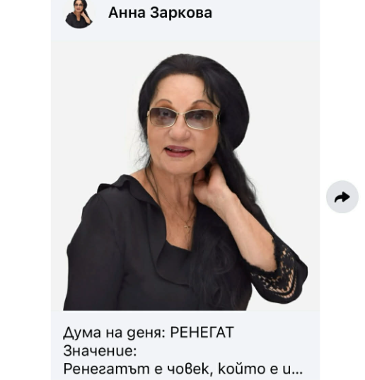 Впоследствие тя изтри поста си в социалната мрежа за значението на думата "ренегат", която според тълковния речник носи синоним и за дезертьор - особено подходящо явно определение за действията на бившия главнокомандващ, напуснал предсрочно поста си на "Дондуков" 2, но онлайн следите остават.