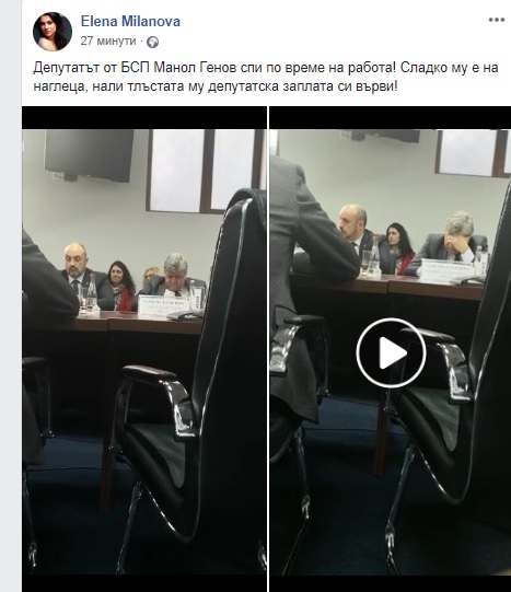 "Депутатът от БСП Манол Генов спи по време на работа! Сладко му е на наглеца, нали тлъстата му депутатска заплата си върви!", пише Елена Миланова, която е публикувала две комични видеа с народния избраник, а отдолу потребители коментират, че вероятно е имал тежка нощ.