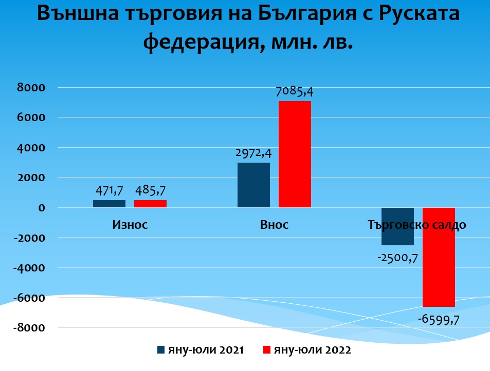 • Вносът на България от Руската федерация по данните на НСИ е достигнал 7.09 млрд. лв. за периода януари-юли 2022 г. при 2.97 млрд. лв. за същия период на предходната година. Това означава, че вносът на България от Русия е нараснал със 138.4%.