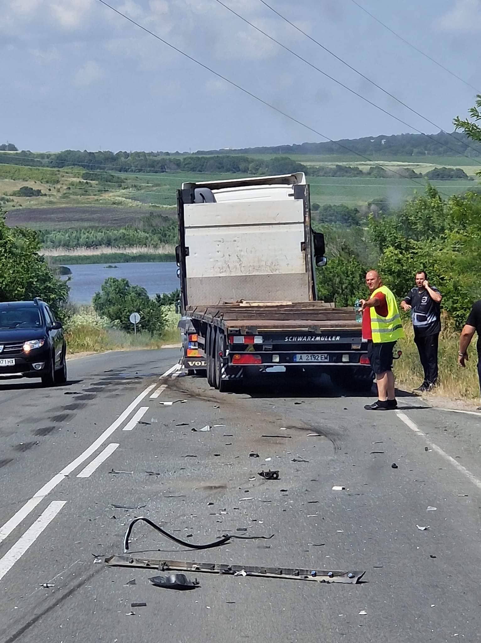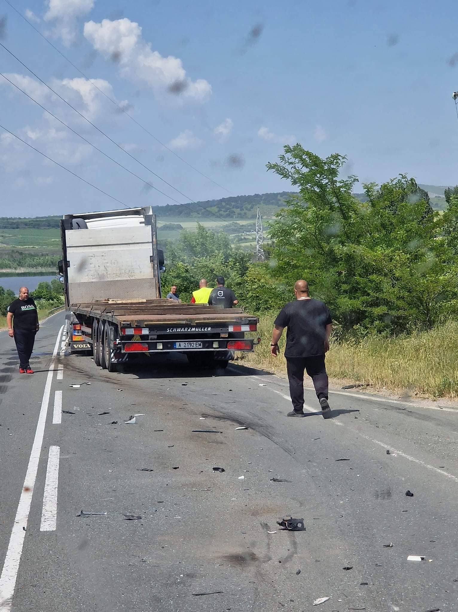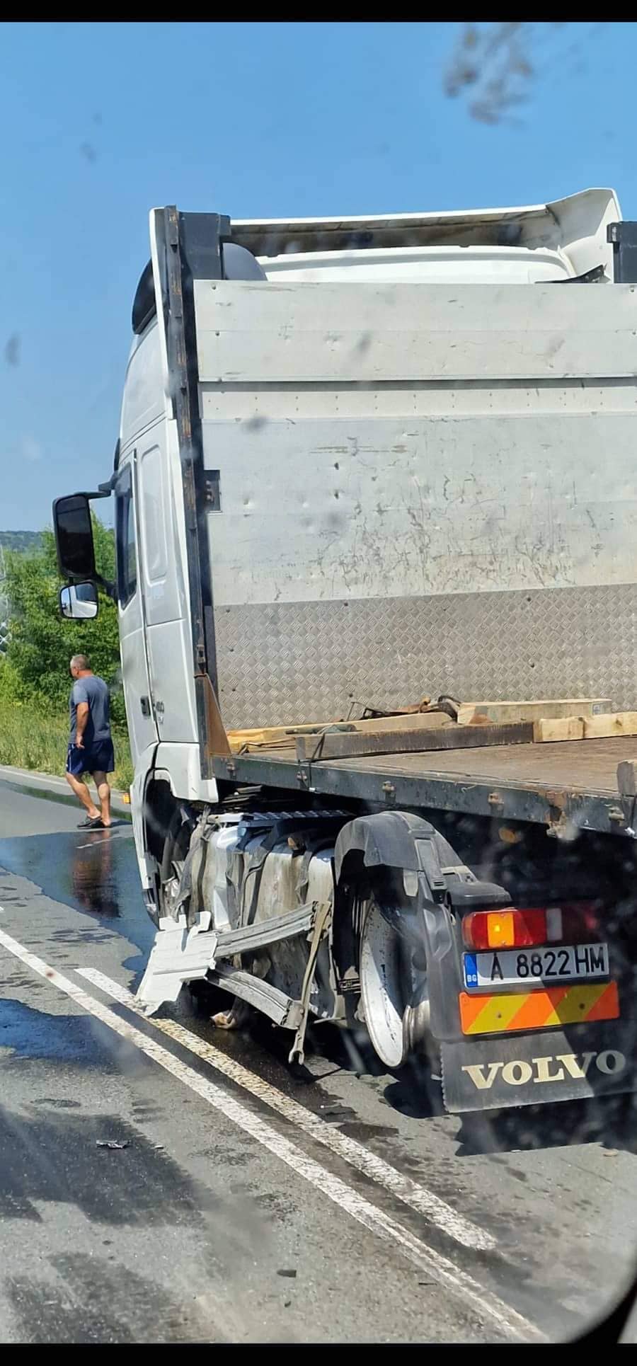 Причината за ПТП-о е неправомерно изпреварване. Шофьорът на лекия автомобил се забил в резервоара на тира и благодарение на големия си късмет, не е причинил взрив. Заради инцидента целият път е облян от дизел, на място е полиция, която прави оглед.