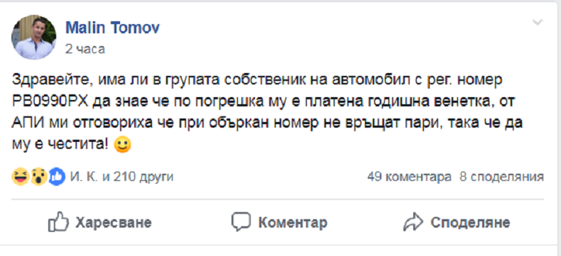 "Здравейте, има ли в групата собственик на автомобил с рег. номер PB0990PX. Да знае, че по погрешка му е платена годишна венетка, от АПИ ми отговориха че при объркан номер не връщат пари, така че да му е честита!“.