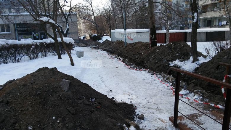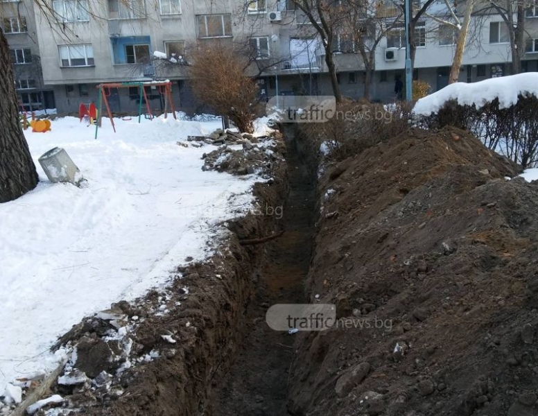 Работници на ЕВН са разкопали градинката „Еталона”, за да могат да свържат блоковете към новото захранване. Очаква се в близките дни проблемът на хората да бъде решен.