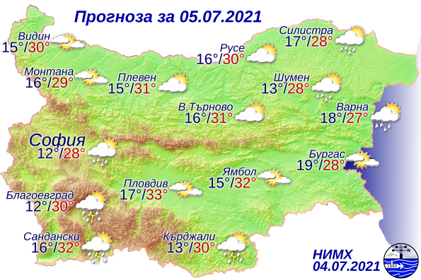 През днешния ден времето ще е предимно слънчево. По-значителни временни увеличения на облачността ще има над Югозападна България и североизточните райони и на отделни места там след обяд ще превали и прегърми. Вятърът ще е слаб до умерен от север-северозапад. Максималните температури ще са между 28° и 33°. Атмосферното налягане ще е по-ниско от средното за месеца. Това съобщават от Националния институт по метеорология и хидрология (НИМХ).