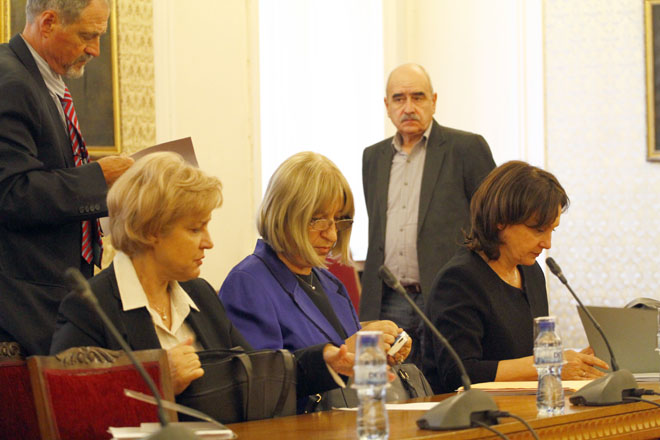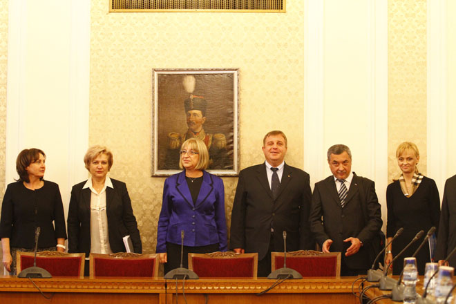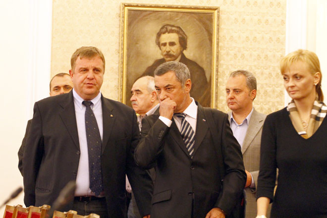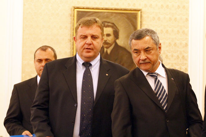 На срещата с ГЕРБ обаче се появиха лидерите на НФСБ и ВМРО Валери Симеонов и Красимир Каракачанов, придружени от Веселинов и Карастоянова.