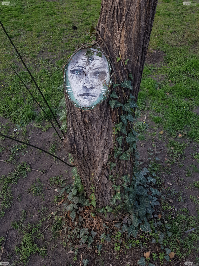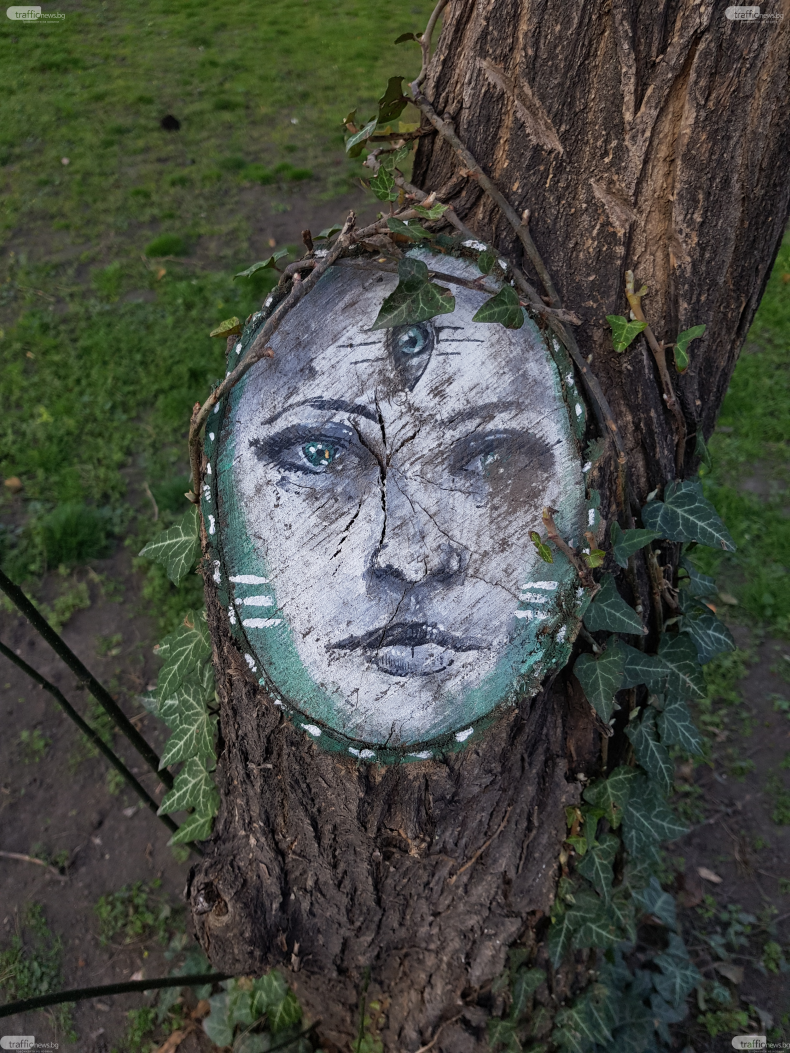 Мистичен женски лик следи с особен дълбок поглед минувачите в квартал "Съдийски" в Пловдив. Майстор е изрисувал плоскостта, образувала се при отрязване на клон от дърво, разположено в парково пространство между къщи и кооперации в района, съобщава "Трафик Нюз".