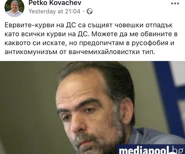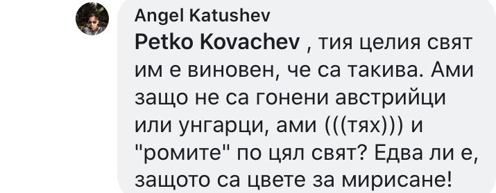 Явно сред приближените на Тома Белев, какъвто е самопровъзгласилият се за еколог Петко Ковачев, продължава гаврата с еврейския народ и Холокоста. В пост във фейсбук Ковачев нарича представителите на Федерацията на ционистите в България с още по-грозен и гнусни обиди. Същото прави и друг привърженик на „дясната“ коалиция Ангел Катушев (виж снимките).