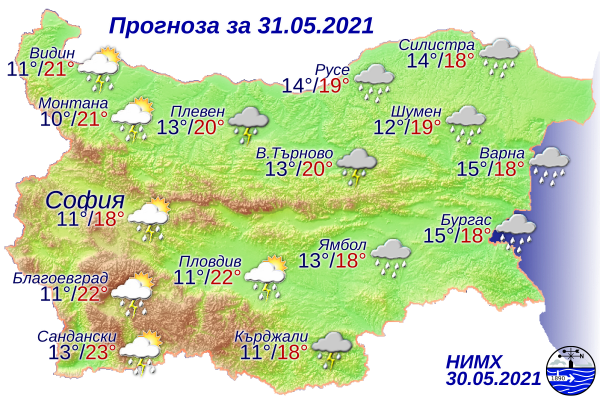 Максималните температури в последния ден на май ще са между 17° и 22°, прогнозират от НИМХ.