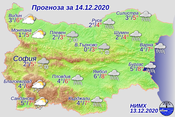 Вятърът ще се усили, по-чувствително през деня в източната половина на страната, където ще е умерен до силен от север, в останалите райони ще е слаб до умерен от северозапад. Минималните температури ще са предимно от 1° до 6°, максималните от 2°-3° в Предбалкана до 8°-9° в югоизточните райони.