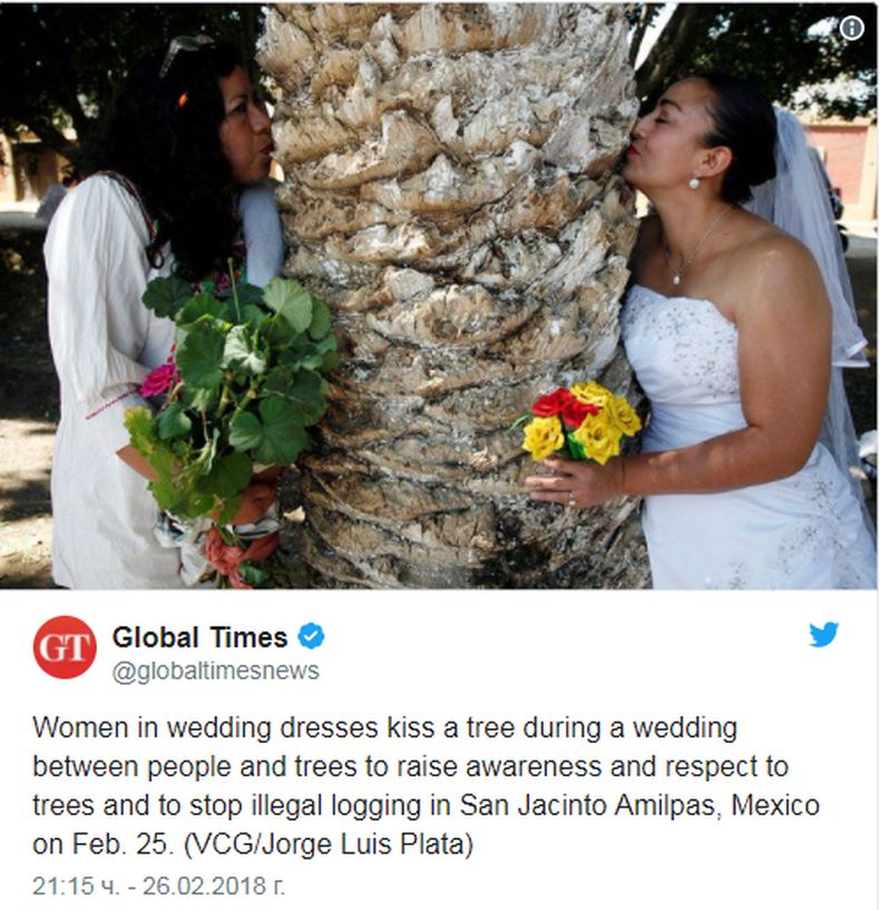 Мексиканки масово се омъжват за дървета с екологична цел, така че да ги защитят от изсичане, пише в. Метро". Младоженците са по-скоро мълчаливи и не обичат празните разговори, но за сметка на това са много снажни и правят големи неща за планетата, пише "Монитор". Снимки от масова венчавка с мексиканки младоженки в булчински рокли се появиха в социалните мрежи. Невестите бяха заснети как страстно целуват кората на дърветата, в случая огромни палми.