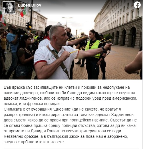Във връзка със засипващите ни клетви и призиви за недопукане на насилие довечера, любопитно би било да видим какво ще се случи на адвокат Хаджигенов, ако се изправи с подобен уред пред американски, немски, или френски полицаи...Това написа на страницата си във Фейсбук Любен Дилов-син, който постна и снимка на адвоката с огромна прашка.