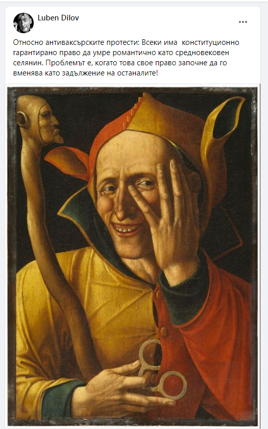 "Относно антиваксърските протести: Всеки има конституционно гарантирано право да умре романтично като средновековен селянин. Проблемът е, когато това свое право започне да го вменява като задължение на останалите!", написа във Фейсбук депутатът от ГЕРБ-СДС Любен Дилов-син.