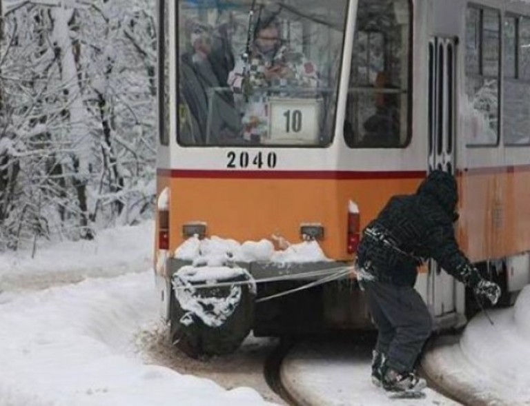 Младежът се върза за преминаващ травмай на една от спирките. После се пусна по заснежените релси на парка.