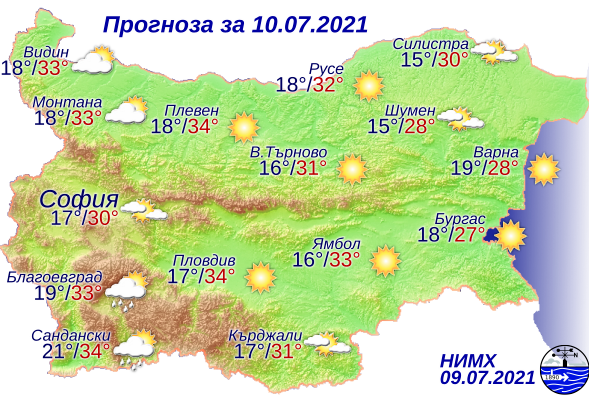 В съботния ден времето над страната ще е слънчево, след обяд над югозападните райони с временни увеличения на облачността, почти без валежи. Ще духа до умерен вятър от изток-североизток. Максималните температури ще са между 29° и 34°, малко по-ниски по Черноморието. Атмосферното налягане ще се понижи и ще се доближи до средното за месеца. Това съобщават от Националния институт по метеорология и хидрология (НИМХ).