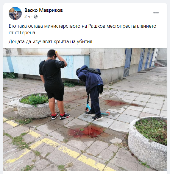 Ето така остава министерството на Рашков местопрестъплението от ст.Герена. Децата да изучават кръвта на убития. Това написа на стената си във Фейсбук тв водещият Веско Мавриков и публикува брутална снимка, показваща оставените кървави следи след показното убийство на 44-годишния криминално проявен и осъждан Георги Христов.