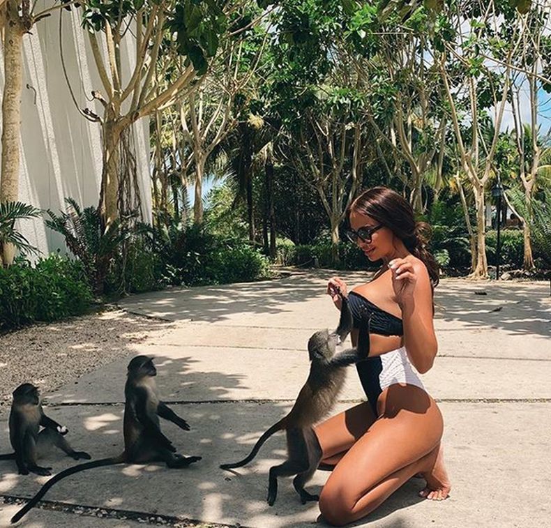 Любопитна снимка Николета Лозанова разбуни духовете в социалните мрежи. Плеймейтката сподели кадър, на който позира с три маймунки, а една от тях я е хванала за бюста.