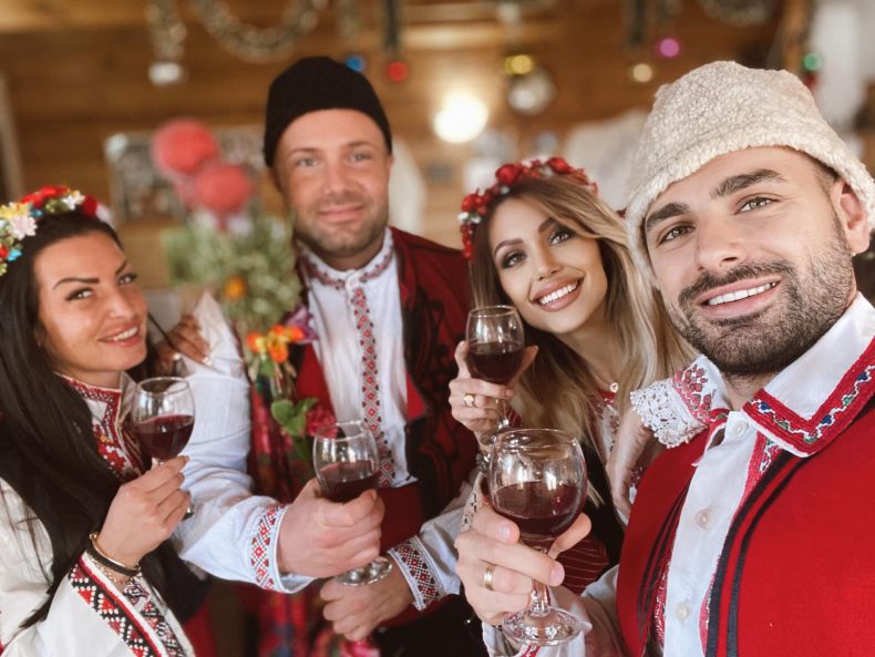 "Две хорца, чаша вино, малко песни и денят е прекрасен! Изненадахме кумувете ни с посещение при най-известните баби в страната!", написа към кадъра Джулката.