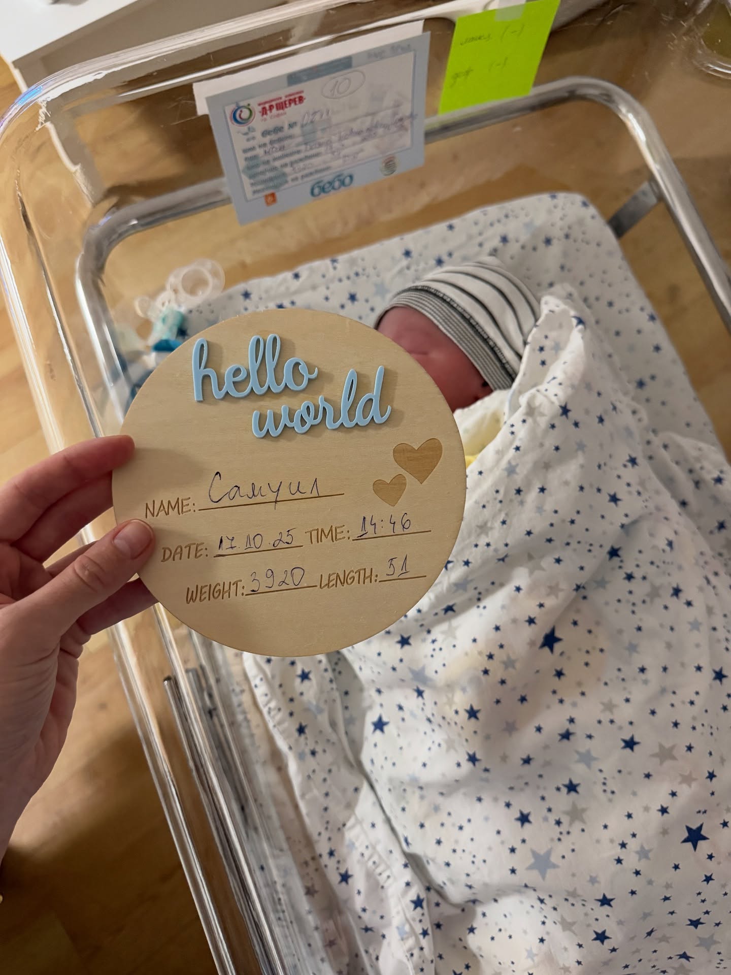 На снимката се вижда новороденото, а до него - табелка с надпис "Hello world" и името Самуил. Момченцето се е появило на бял свят на 17 октомври 2025 г. с тегло 3,270 кг и ръст 51 см.