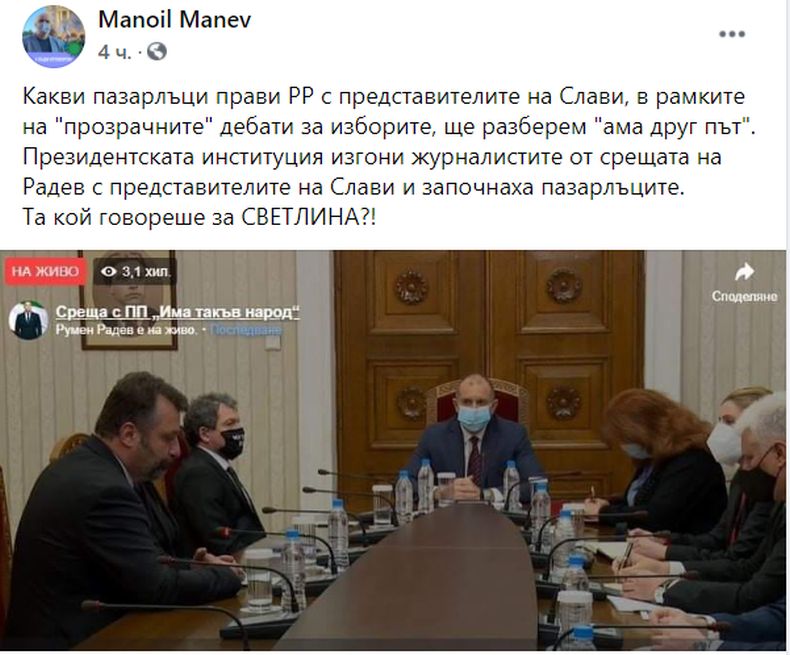 Депутатът от ГЕРБ Маноил Манев реагира остро по повод изгонените медии от срещата на Румен Радев със сценаристите от Трифонов. При срещата на обитателя на "Дондуков" 2 със здравния министър и представители на НОЩ, срещата се излъчваше на живо, за да може да се чуе острия тон на Радев и постоянните му критики.