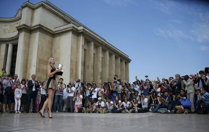Победителката в тазгодишното издание на Откритото първенство на Франция "Ролан Гарос" Мария Шарапова направи специална фотосесия с трофея пред Айфеловата кула в Париж.