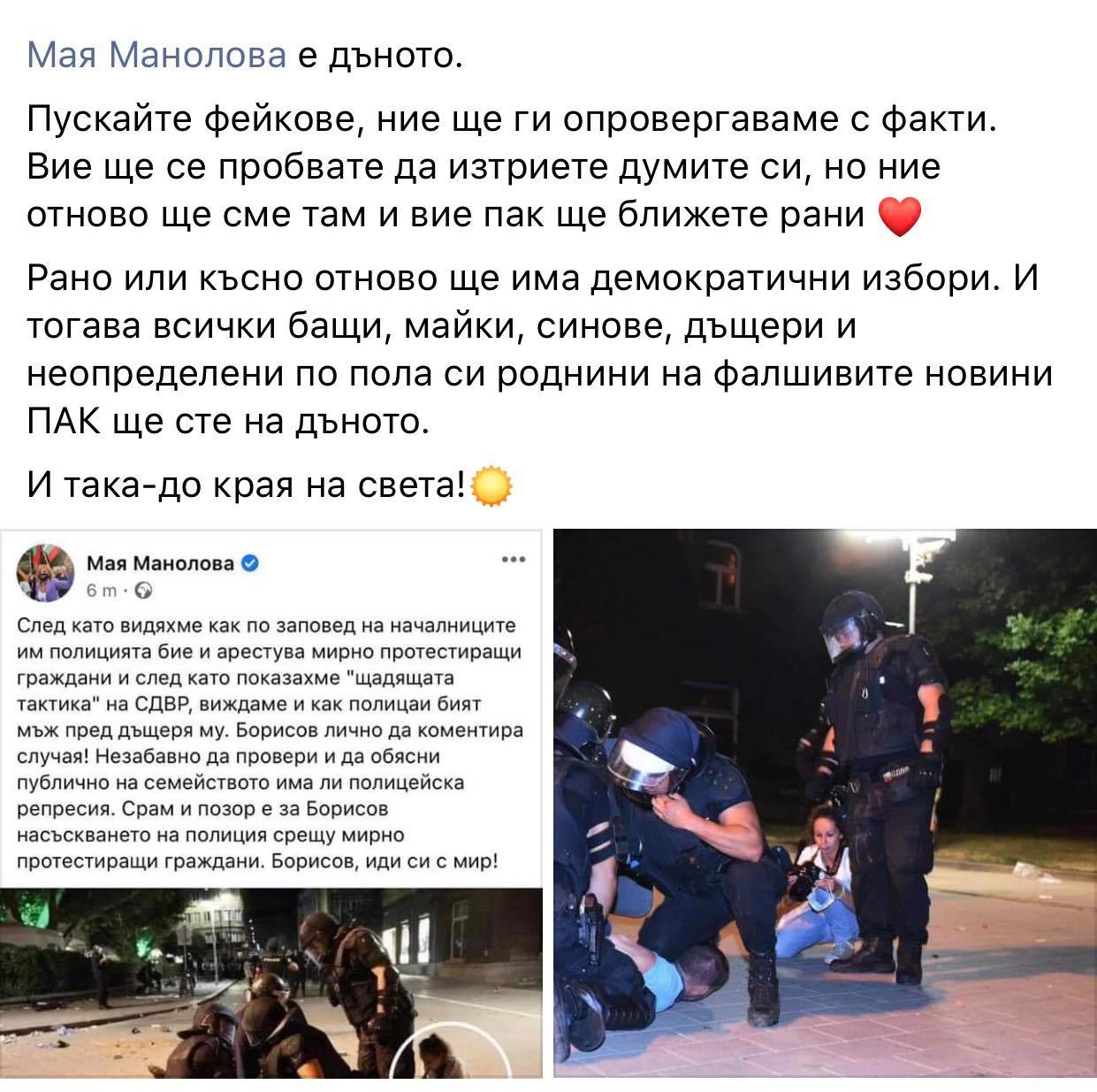 След като истината лъсна, Манолова побърза да свали фалшивата новина от профила си, но скрийншот с безумните й брътвежи за полицейско насили, я заковава на място и й носи званието Царица на фалшивите новини.