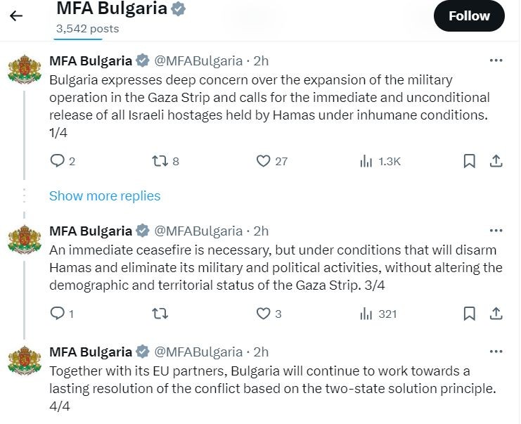 България изразява дълбока загриженост от разширяването на военната операция в Ивицата Газа и призовава за незабавното и безусловно освобождаване на всички израелски заложници, държани от "Хамас" в нечовешки условия. Това се посочва в публикация на страницата на Министерството на външните работи (МВнР) в социалната мрежа "X".