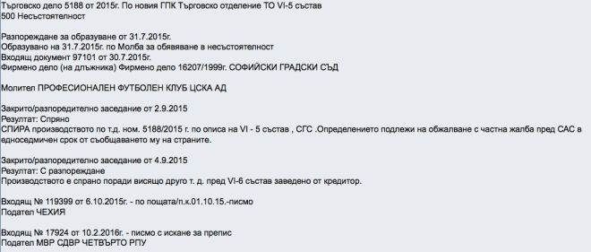 В него се казва, че на 10 февруари 2016 г. 4-то РПУ е поискало препис от делото образувано по молба за обявяване в несъстоятелност, подадена от изпълнителния директор на червените Александър Тодоров.